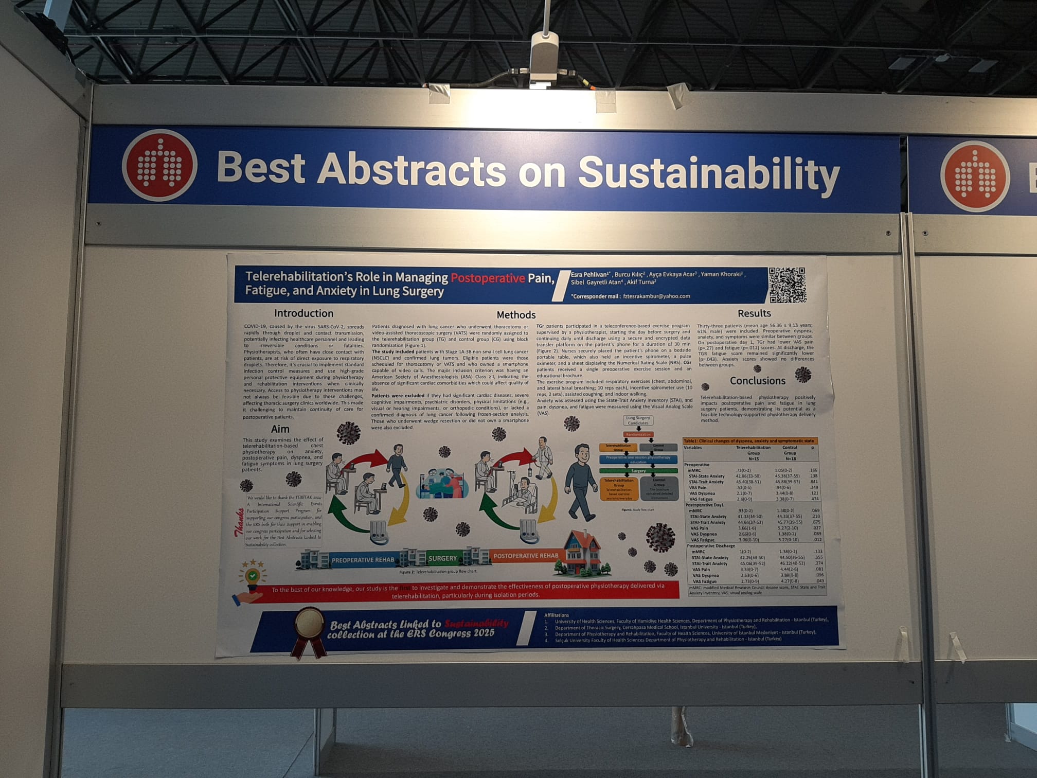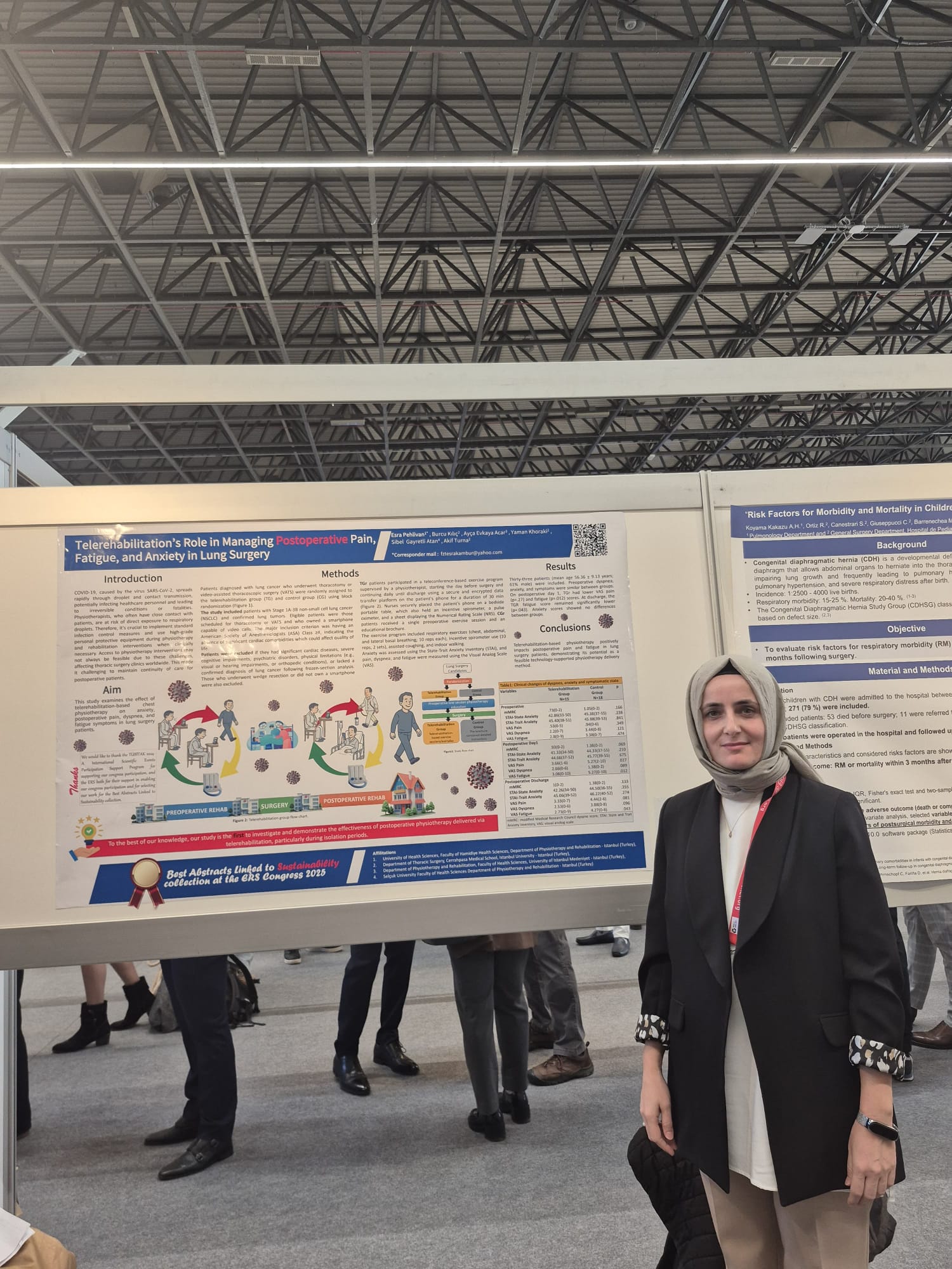 Fakültemiz Fizyoterapi ve Rehabilitasyon Bölümü öğretim üyelerimizden Doç. Dr. Esra Pehlivan, Amsterdam'da, 27 Eylül- 1 Ekim 2025 tarihleri arasında gerçekleştirilen, European Respiratory Society (ERS) 2025 Kongresinde "Telerehabilitation’s Role in Managing Postoperative Pain, Fatigue, and Anxiety in Lung Surgery" adlı bildirisiyle, “Best Abstracts Linked to Sustainability” ödülünü almıştır. Öğretim üyemiz ayrıca kongrede lisansüstü öğrencilerimizin de katılımıyla toplamda 4 bildiri ile kongreye katkı sağlamıştır. Fakülte olarak öğretim üyemizi tebrik ediyoruz.