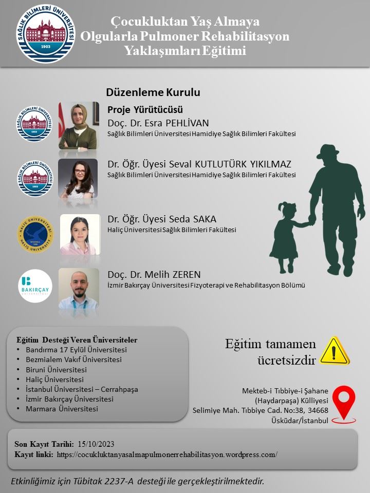 16-17 Aralık 2023 tarihlerinde üniversitemiz ev sahipliğinde "Çocukluktan Yaş Almaya Olgularla Pulmoner Rehabilitasyon" eğitimi ,Tübitak 2237 A desteği ile gerçekleştirilmiştir. Doç. Dr. Esra Pehlivan'ın düzenleme komitesi başkanlığı yaptığı eğitime, ülke çapında öğrenci ve eğiticiler katılmış olup, yoğun eğitim, workshoplarla zenginleştirilmiştir. Eğitime destek veren başta Tübitak olmak üzere, tüm eğitmen hocalarımıza teşekkürlerimizi sunarız.