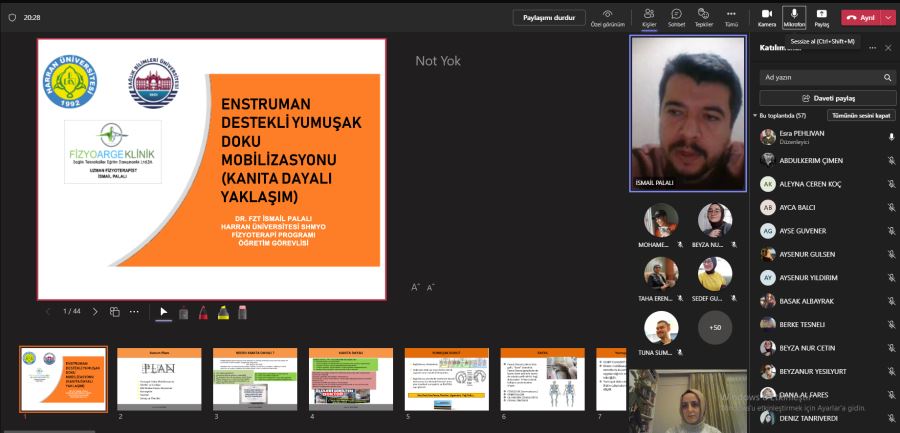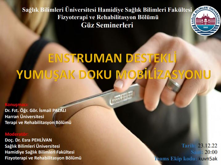 Sağlık Bilimleri Üniversitesi Sağlık Bilimleri Fakültesi Fizyoterapi ve Rehabilitasyon Bölümünün bilimsel etkinlikler kapsamında hazırladığı "Enstruman Destekli Yumuşak Doku Mobilizasyonu" konulu semineri, 23 Aralık 2022 tarihinde Microsoft Teams platformunda gerçekleşmiştir. Konuşmacı olarak bize destek veren Sayın Dr. Fzt. İsmail Palalı' ya çok teşekkür ederiz.