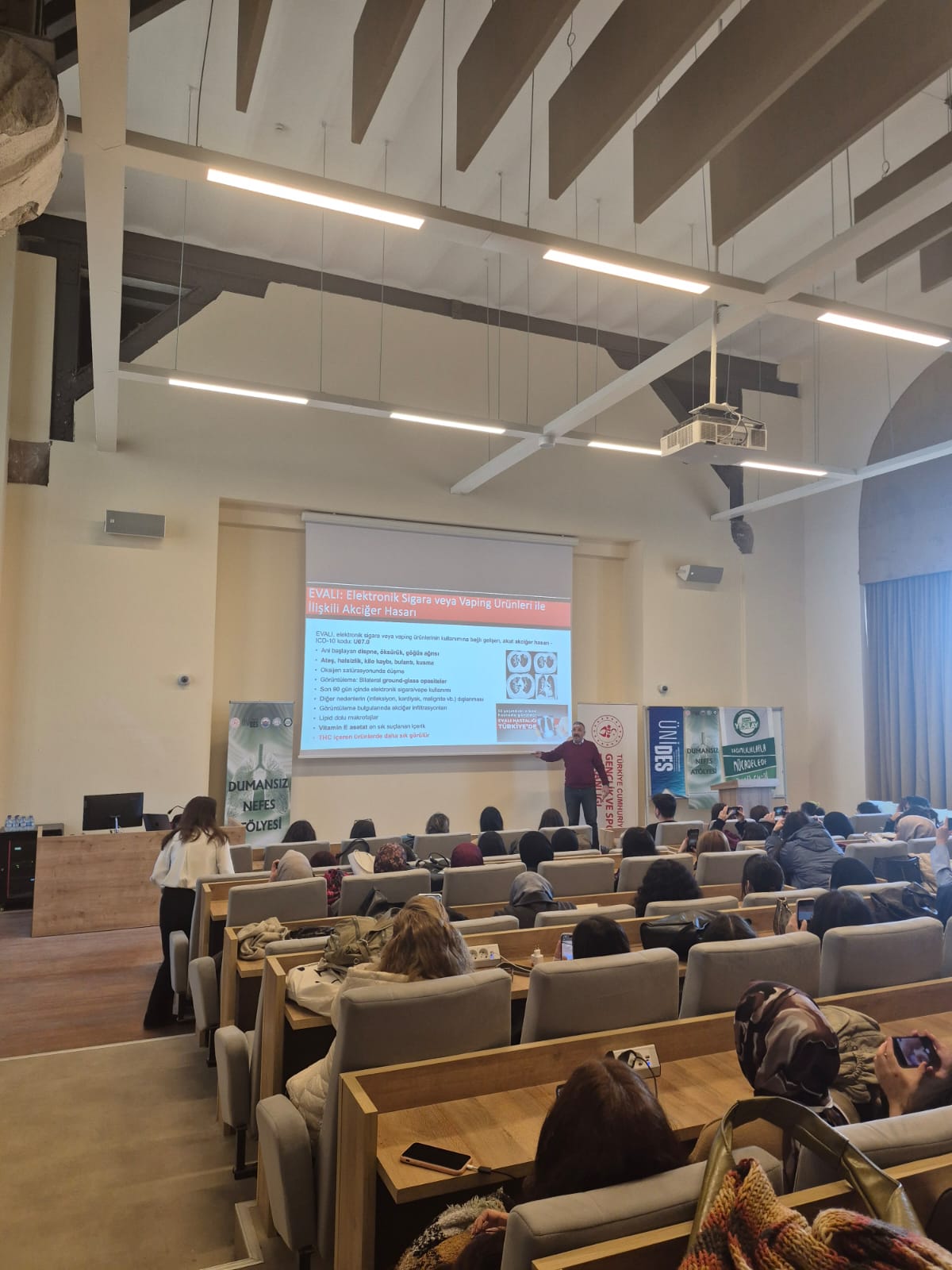 Etkinliğin konuşmacısı Doç. Dr. Volkan Kara, “Elektronik Sigara Gerçekleri” başlıklı sunumunda elektronik sigara kullanımının sağlık üzerindeki etkileri, bağımlılık riski ve gençler üzerindeki olası sonuçları hakkında önemli bilgiler paylaştı.