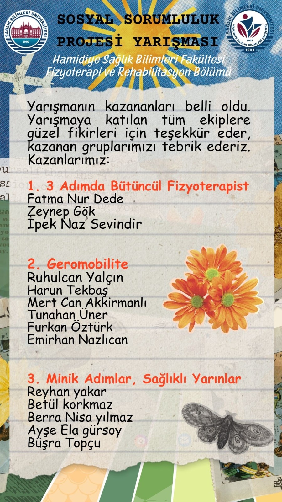 Sağlık Bilimleri Üniversitesi Hamidiye Sağlık Bilimleri Fakültesi Fizyoterapi ve Rehabilitasyon Bölümü tarafından düzenlenen Sosyal Sorumluluk Projesi Yarışması sonuçlanmış olup, değerlendirme süreci sonucunda dereceye giren projeler belirlenmiştir.